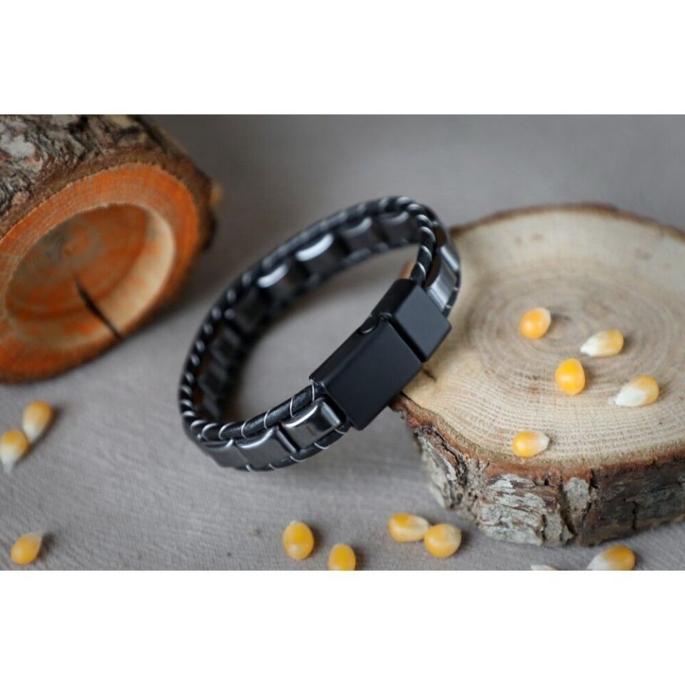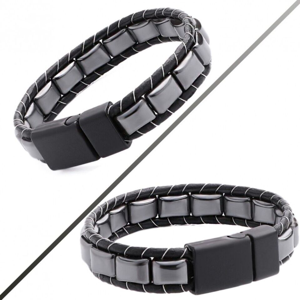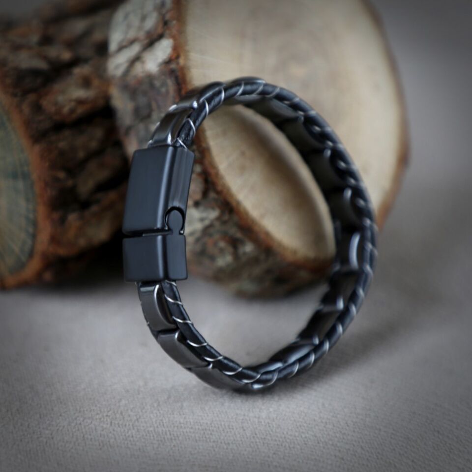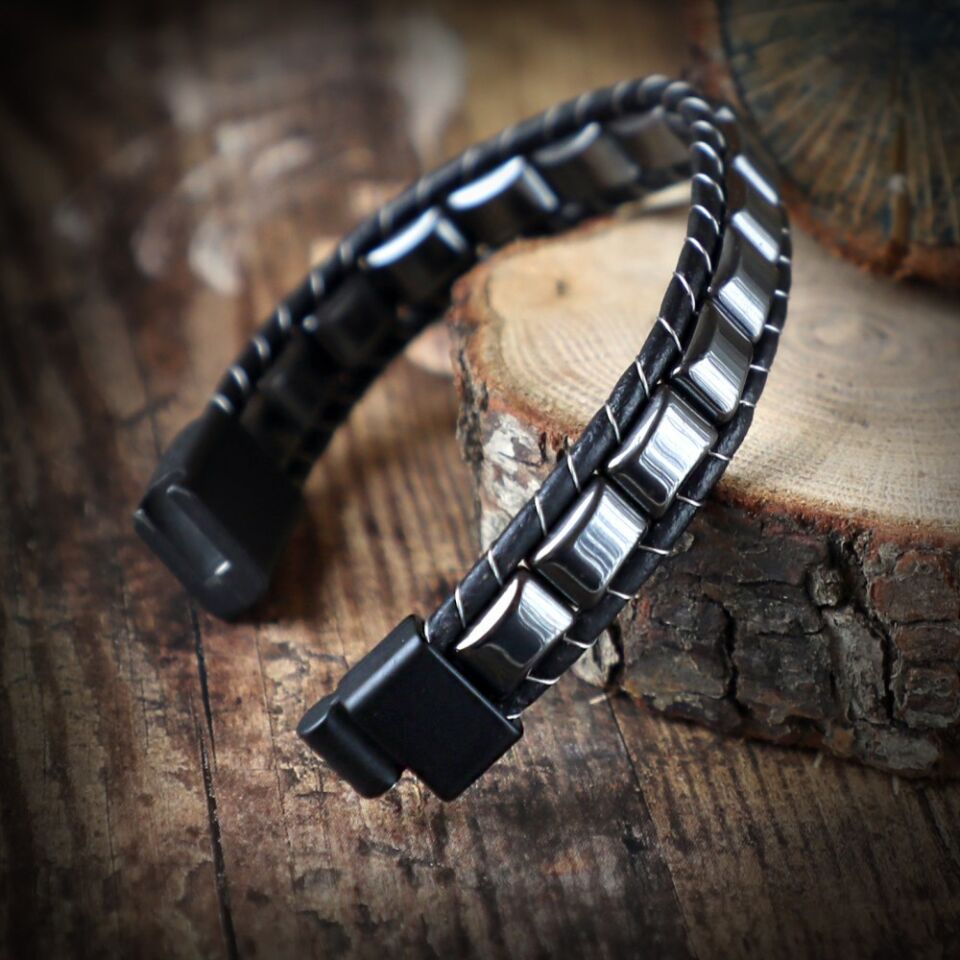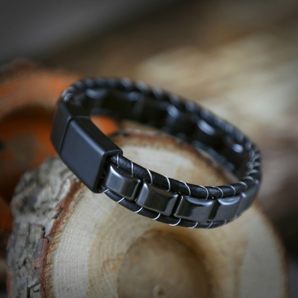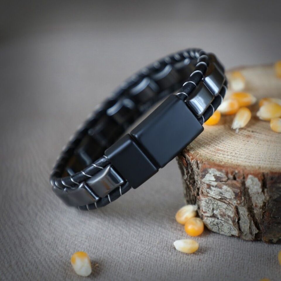 Hematit Örmeli Deri Bileklik 21 cmSiyah
