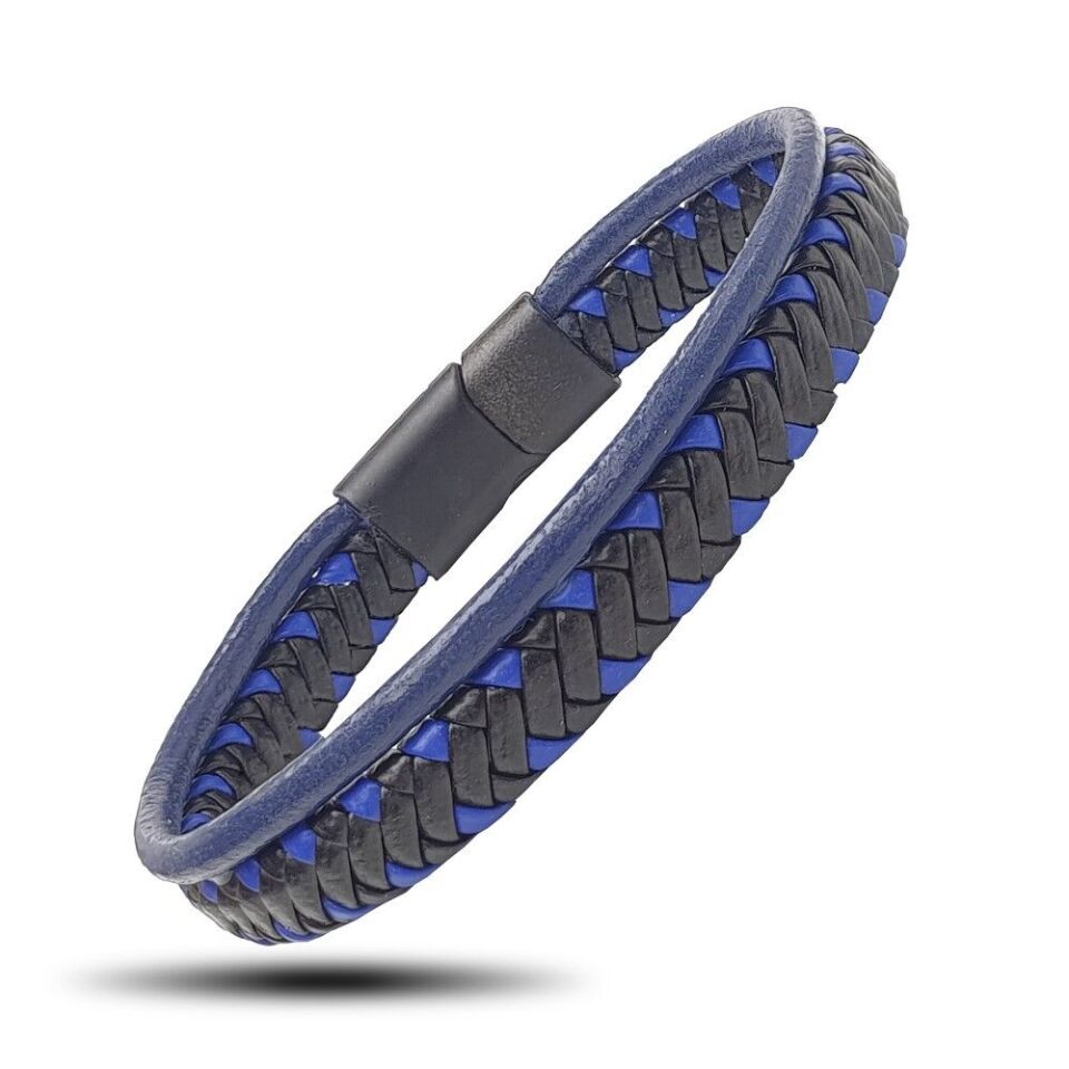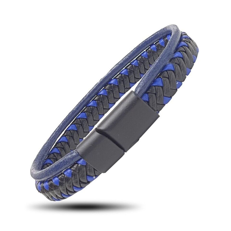 Mavi Deri Örgü Çelik Çoklu Erkek Bileklik