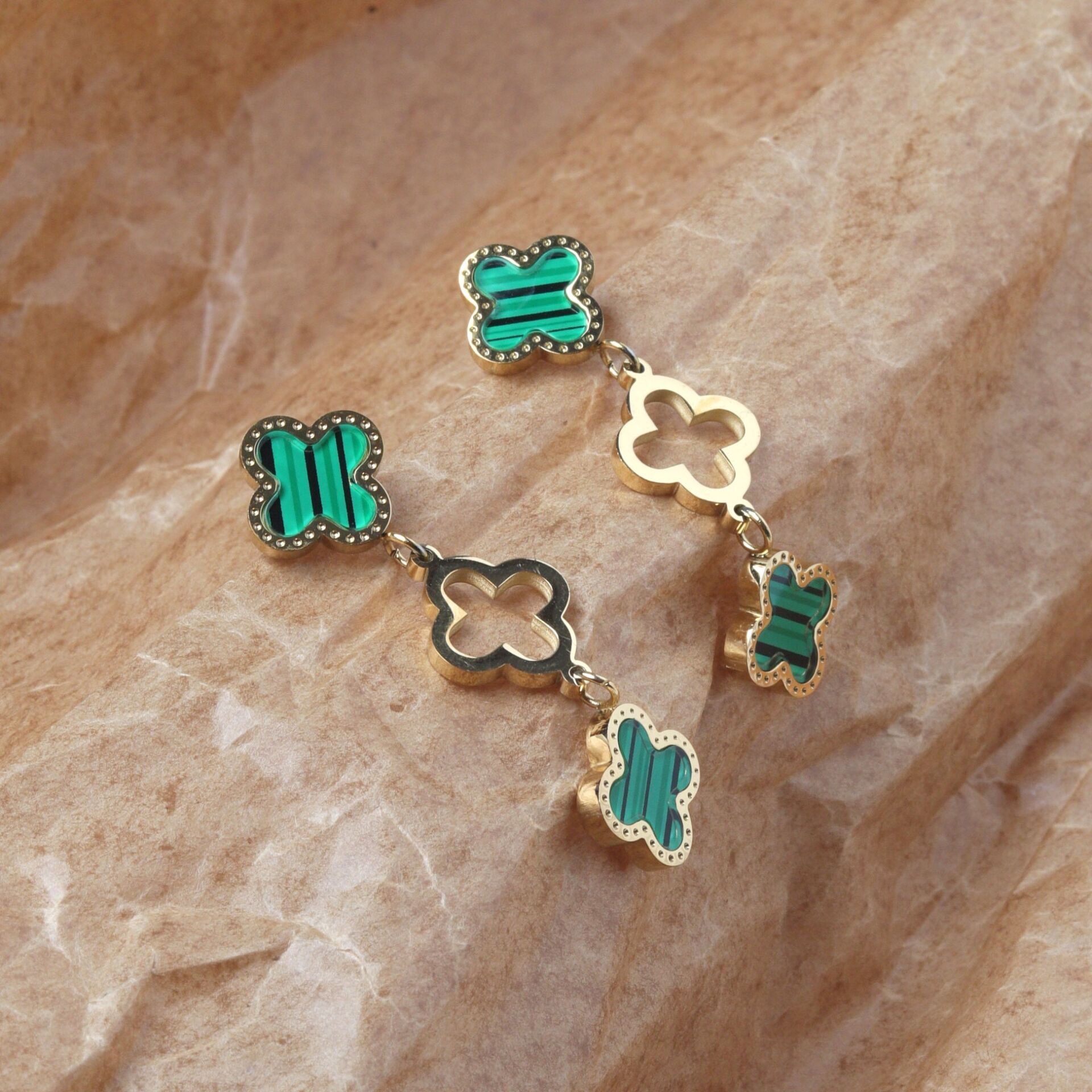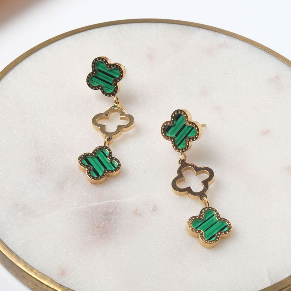 Neesa Çelik Gold Yeşil 3'lü Yonca Sallantılı Küpe 39mm Gold